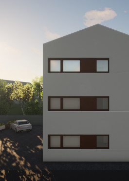Die Schwierigkeit beim Entwurf war das kleine Grundstück und dazu der Wunsch die Scheune ebenfalls als Wohnraum zu nutzen. Da diese in Bezug auf das bestehende Tragwerk und der vorhandenen Raumhöhe nicht dafür geeignet war, stellte vor allem das bei der Planung eine große Herausforderung dar. Durch den zusätzlichen Umbau der Scheune, sowie der Aufnahme des schrägen Grenzverlaufs auf der Südseite des Gebäudes, wurde bei der Umsetzung der maximal mögliche Wohnraum geschaffen. Die schrägen Fensterlaibungen geben dem Gebäude noch das gewisse Etwas und begünstigen zudem den Lichteinfall in die Wohnungen.